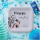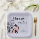Beautiful modern contemporary pastel purple Easter paper plates with a hand illustrated pink bunny and abstract floral silhouette. Personalise with your own family name
