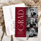 Stylish graduation party invitation postcards featuring the graduate's three photos located to the right of the design in a vertical layout. "Grad" is displayed in white, modern art deco lettering with a burgundy background. Personalise the modern photo graduation party invite by adding the graduate's name, graduation year, and school name. The postcard reverses to display your return address and graduation party details. Perfect for both high school and college graduations!