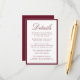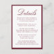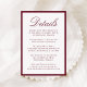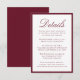 This wedding details card highlights “Details” in romantic burgundy calligraphy, paired with coordinating serif text for your reception, hotel accommodations, and wedding website information. The bold burgundy border adds warmth and richness to the design, creating a dramatic yet elegant look. Perfect for fall, winter, and formal evening weddings, this colorway offers a refined way to present important details with a touch of classic romance.