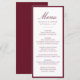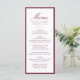 This wedding menu features “Menu” in rich burgundy calligraphy, paired with classic serif typography for the couple’s names, wedding date, and reception courses. The deep burgundy border frames the design with warmth and sophistication, making it an elegant choice for formal, romantic, and evening celebrations. With its refined layout and timeless color palette, this menu card presents your dining selections in a polished, cohesive style that complements a classic wedding table setting.