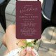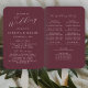 This elegant, modern wedding program fan features white text on a burgundy background. The titles and subtitles appear in beautiful calligraphy script, with the couple's names in serif and the remaining text in sans serif font.