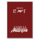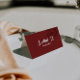 Modern minimalist wedding place card designed for a clean and elegant reception table setting. This folded escort card features a handwritten script wedding name paired with contemporary typography. The deep red wedding decor adds a fresh, stylish touch to your wedding. Perfect as a custom guest name card for a chic and simple wedding celebration. Use this elegant folded place card to elevate your modern reception table decor. A sophisticated contemporary wedding table card that complements any minimalist wedding theme.