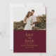 Announce your special day in style with our Modern Burgundy Custom Photo Save the Date Card. The top half features a photo, complemented by gold text against a burgundy background below. The back displays elegant gold monograms on a burgundy backdrop. A chic and personalised way to mark your wedding date.