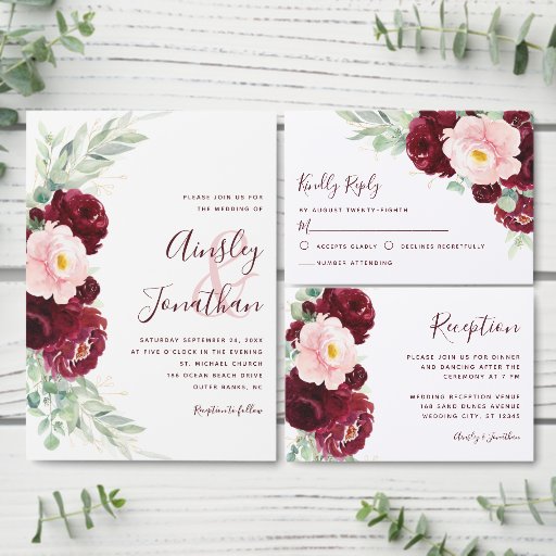 Set the tone for your special day with these modern burgundy floral wedding invitations, featuring real gold foil for added elegance. A bouquet of watercolor flowers with eucalyptus greenery foliage is on the left side, with right-justified text featuring stylish modern script for the names and easy to personalise templates.