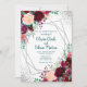 An elegant watercolor design of large roses in shades of burgundy, Marsala, and pink with a silver geometric frame and confetti on a white background. The back of the card has a dark turquoise background with a small floral arrangement in the centre. You can customise the fonts any way you like and add your own special message.