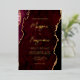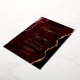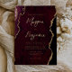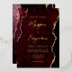 This elegant wedding invitation features a background image of burgundy red watercolor agate trimmed with faux gold glitter. The customisable text combines gold-coloured modern handwriting, copperplate and italic fonts. The reverse side features a coordinating burgundy and gold agate design.