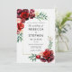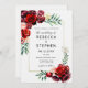 A modern, elegant wedding invitation with a classy red roses and burgundy accents theme, featuring watercolor florals and greenery. Red roses contrast with cream lisianthus flowers, accented by deep red scabiosa and other filler flowers and the whole ensemble makes for a classy design for a modern couple.