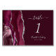 The left-hand edge of this elegant modern wedding table number card features a burgundy watercolor agate border trimmed with faux silver glitter. The customisable text combines silver grey handwriting, italic and copperplate fonts on a burgundy red background.