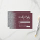 The left-hand edge of this elegant modern wedding RSVP enclosure card features a silver faux glitter border. The customisable text combines silver grey handwriting script and sans serif font on a burgundy red background. The reverse side features a matching burgundy and silver design.