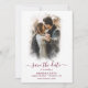 Elegant personalised burgundy wedding photo save the date cards with a modern script font to complement your romantic burgundy wedding party. Easily personalise online. Simply upload your favourite engagement photo and type in your wedding details using our modern template and create beautiful cards to inform your family and friends about your new adventure.