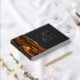This elegant wedding guest book features a burnt orange watercolor agate design trimmed with faux gold glitter. Easily customise the real gold foil text on an off-black background, with the names of the couple in whimsical handwriting calligraphy over a large grey ampersand. Add additional text of your choice to the front and spine.