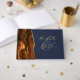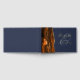 This elegant wedding guest book features a burnt orange watercolor agate design trimmed with faux gold glitter. Easily customise the real gold foil text on a navy blue background, with the names of the couple in whimsical handwriting calligraphy over a large ampersand. Add additional text of your choice to the front and spine.
