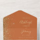The left-hand edge of this elegant modern all-in-one wedding invitation and RSVP features a gold faux glitter border. The customisable text combines gold-coloured whimsical handwriting, copperplate and italic fonts on a burnt orange background. The return address appears on the outside flap and the reverse side of the detachable RSVP card in gold-coloured text on solid burnt orange. A QR code is included on the RSVP card for guests who would prefer to reply online.