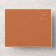 The left-hand edge of this elegant modern all-in-one wedding invitation and RSVP features a gold faux glitter border. The customisable text combines gold-coloured whimsical handwriting, copperplate and italic fonts on a burnt orange background. The return address appears on the outside flap and the reverse side of the detachable RSVP card in gold-coloured text on solid burnt orange.