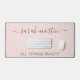 Elegant desk mat in blush pink featuring your business name with swashes in a grey handwritten script calligraphy along with your tagline. This simple and feminine design is great for a makeup artist, hair stylist, lashes technician, beauty / nail salon or any woman owned business.