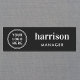 Professional black name tag featuring your business or organisation's logo, your name in bold minimal modern white typography and title in simple white typography.