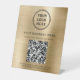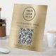 Modern professional table top pedestal sign for your business featuring a brushed gold faux metallic background and your QR code for customers to scan to view your products, services, prices, other information or make mobile payments. Upload your logo and QR code and add your custom text, such as company name, phone number, street address or other information in a simple font.