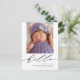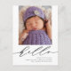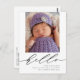 This elegant birth announcement postcard features modern calligraphy that reads "hello" and a large photo. Underneath the script lettering, you can add your baby's full name, birth date, birth stats, and your names. On the back of the postcard, you can write a custom message to loved ones.