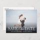 Stylish wedding save the date announcement postcard design features a full frame horizontal engagement photo with "save the date" in an elegant combination of serif and script font. Includes wording on the front and back of the postcard that can be personalised with all of the important details.