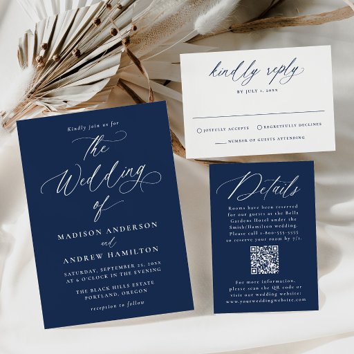 Streamline your wedding details with this QR code enclosure card, featuring "Details" in elegant white calligraphy on a sophisticated navy background. Perfect for weddings in any season and suited for both formal and casual celebrations, this modern design allows couples to include essential wedding information such as reception details, hotel accommodations, and their wedding website in bold white lettering. The card also features a QR code, giving guests quick and easy access to the couple's wedding website for additional details. Combining timeless elegance with practicality, this enclosure card is the perfect finishing touch to your wedding suite.