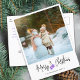Modern Christmas Holiday postcard with one large photo, calligraphy script, purple mittens and custom message.