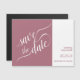 These save the date cards are simple, modern, minimalist, and elegant. They feature a contemporary two pane design. The dusty rose or mauve pink panel on the left has script calligraphy reading "save the date." The panel on the right has your names, the wedding date, and location in a trendy right justified layout. Beautiful way to help your friends and family remember your upcoming special day.