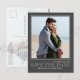 An elegant simple save-the-date wedding card with a modern elegant engagement engaged couple with a two photo picture layout, with a scannable QR code for website online information and more details, a stylish trendy typography font text, a golden neutral budget friendly postcard, a minimal save our date card, a creative stylish calligraphy script, a simplistic elegance save-the-date, a simple modern border photo cards, a modern save the date cards, a casual modern save the date