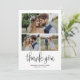 This three photo calligraphy wedding thank you card features your wedding photos, with calligraphy script overlay. Customise your special wedding thank you on the back, or remove it to leave the back blank for your handwritten message of thanks.