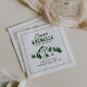 Modern camping bachelorette party napkins featuring a drawing of a campsite featuring mountains, trees, a log fire, a tent, and a text template that is easy to personalise.