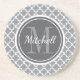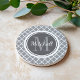 A modern sandstone coaster featuring a classic quatrefoil pattern in charcoal grey and white with a bold circular monogram frame displaying a custom initial and family name in elegant script. The timeless geometric pattern paired with the personalised centre creates a sophisticated accent for any home. A great gift for housewarmings, weddings, or anyone who appreciates classic pattern design. All text is fully customisable.