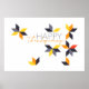 Modern, playful, cheerful graphic design of a saying "Happy Thanksgiving" with geometric shapes in autumn leaves abstraction in red, orange and grey colors. Handwritten, urban typography.