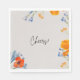 Modern and trendy colourful flower napkins feature an array of orange nastartium and blue wildflowers against a light taupe background with the text "Cheers!'. Spruce things up with a little colour and a 'thank you' at your kitchen tea, bridal shower, picnic, cocktail party or casual luncheon.