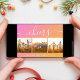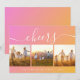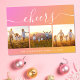 Cheerful minimal holiday card featuring a pink to orange gradient background, three photos and "cheers" written in stylish white script with swashes. You can personalise your names and the year in simple white typography.