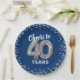 Elegant fortieth birthday party paper plates featuring a trendy blue background that can be changed to any colour, silver sparkly glitter, and the saying "cheers to 40 years" using forty silver hellium balloons.