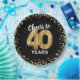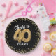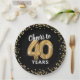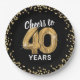 Elegant fortieth birthday party paper plates featuring a stylish black background that can be changed to any colour, gold sparkly glitter, and the saying "cheers to 40 years" using forty gold hellium balloons.
