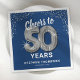 Elegant fiftieth birthday party napkins featuring a stylish navy blue background that can be changed to any colour, silver sparkly glitter, the saying "cheers to 50 years" using silver gold hellium balloons, their name, and the date of the celebration.