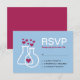 Create your own modern chemistry themed wedding RSVP card. This nerdy response card template is perfect for chemists and scientists who are getting married at a science museum. Pink and Blue design shows intertwined chemistry beakers with hearts. Easily customise with your wedding details.