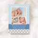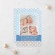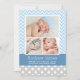 Modern baby birth announcement cards feature three photos of your sweet baby boy framed by stylish chevron stripe and polka dot patterns. White, sky blue, teal blue, and soft pewter grey colour scheme.