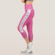 Fun leggings in pink for a keen golfer. The bold geometric pattern at the base of the legs is created from golf clubs and golf balls on a pink background. Bright and cheerful. The text down the side of each leg is in black on a silver grey stripe, and can be customised with your preferred caption - different on each leg if you wish.