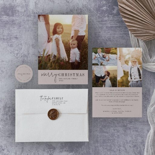 This modern chic neutral photo collage Christmas news holiday card is the perfect stylish holiday greeting. This simple boho design features classic sophisticated calligraphy in minimal bohemian neutral tones. Personalise the card with 5 photos (2 on the front and 3 on the back), your family name, first names, and year. Include an optional year in review or family newsletter on the back of the card.