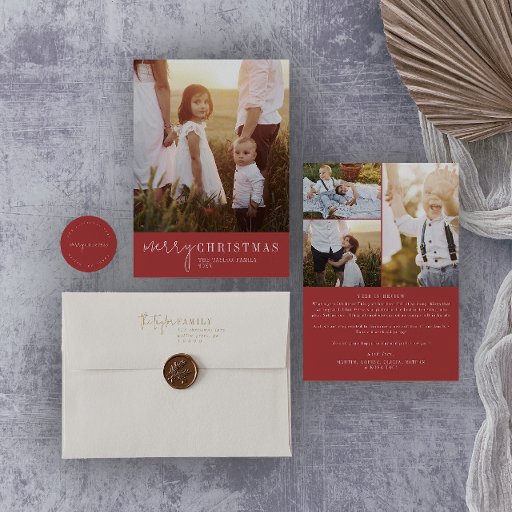 These modern chic red Merry Christmas return address square stickers are perfect for a stylish holiday card or invitation envelope. This simple boho design features classic sophisticated calligraphy in traditional rustic red and white.