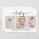 Modern Elegant Chic Script 3 Photo Collage Newborn Baby Thank You Birth Announcement Card. Features a pretty "thank you" text in a handwritten calligraphy swirly swash tail font script in black and white. Pre-made personal message and birth statistics with baby's name are included. Great for baby girl or baby boy. Easy to personalise with your baby photo and details.