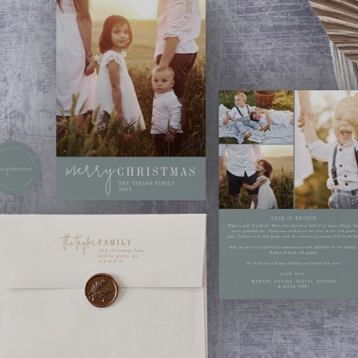 This modern chic seafoam photo overlay Christmas news holiday card is the perfect stylish holiday greeting. This simple boho design features classic sophisticated calligraphy in minimal muted dusty blue green and white. Personalise the front of the card with a photo, your family name and the year. Include 2 additional photos, and an optional year in review or family newsletter on the back of the card.
