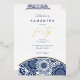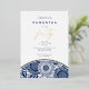 A luxurious modern Chinoiserie-style invitation featuring an elegant deep blue background adorned with intricate gold-foil patterns inspired by traditional Chinese art.