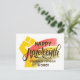 Stylish modern Christian JUNETEENTH Postcard with CUSTOMIZABLE TEXT on the reverse. The design shows paint strokes in red, orange and green, with a background of red, yellow and green grunge-effect brush strokes and yellow power fist. The wording reads HAPPY JUNETEENTH - CELEBRATE FREEDOM IN CHRIST. You can personalise your message on the reverse. This Juneteenth postcard would be great to send to anyone who wants to celebrate this African American Black independence day holiday and also share the Christian message of freedom in Christ Jesus.