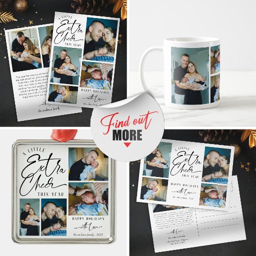 This heartwarming Christmas Postcard features a modern design with a touch of playful charm. The front of the Postcard showcases a delightful collage of family photos, highlighting the newest member of their family. The "A Little Extra Cheer This Year" greeting is written in a stylish, handwritten font, adding a touch of festive joy. The Postcard beautifully captures the magic of welcoming a newborn baby into the world, making it a perfect choice for families looking to share their precious moments and spread Christmas cheer.