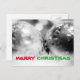 Modern Christmas holiday postcard with the words "Merry Christmas" in red and green and a black and white art photograph of Christmas glass ornaments.