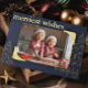 Send the merriest of Christmas cheer with vibrant gold, rose gold, or silver metallic on a deep blue background for this custom photo card. This one makes a striking statement with vintage-look 'metal' photo corner accents and the words, 'merriest wishes' in a large, yet understated font. On the left, you can enter your name or family name in a fancy handwriting script with the current year just below. Let your photo shine bright in a muted dark blue elegantly modern greeting card. Happiest holidays!