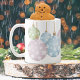 This mug features three non-traditional colour Christmas ornaments in pastel green, pink, and blue with white stars. The ornaments in different sizes encircle the mug over a white background.