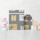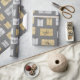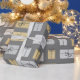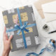 Whimsical and modern holiday pattern features gold and silver doodle style present illustrations on dark grey background.